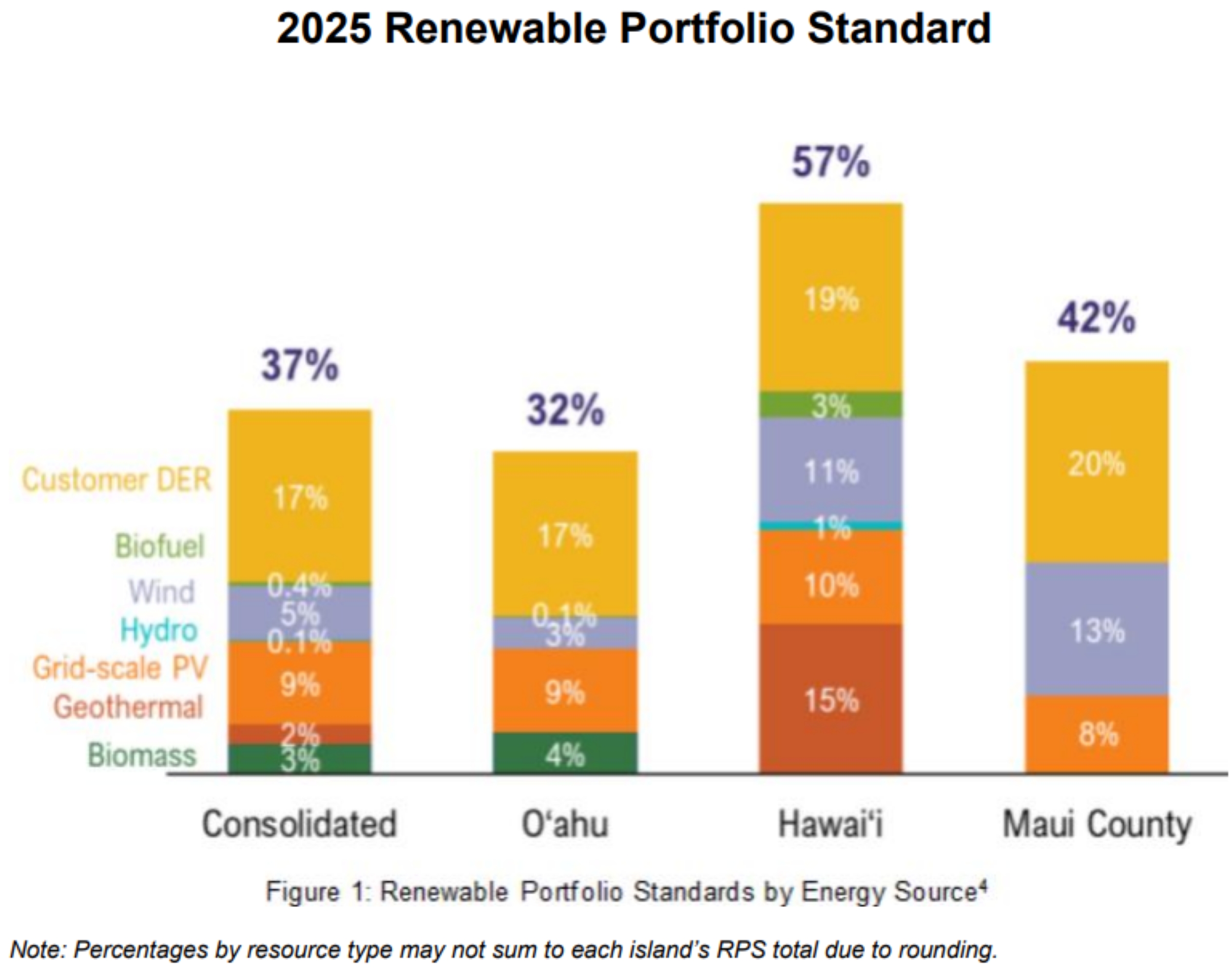 The consolidated renewable portfolio standard is for Oʻahu, Hawaiʻi Island and Maui County and represents the percentage of electricity generated by renewable resources. It increased by 1 percentage point from 2024, despite having the highest year-over-year increase in electricity load since 2004.