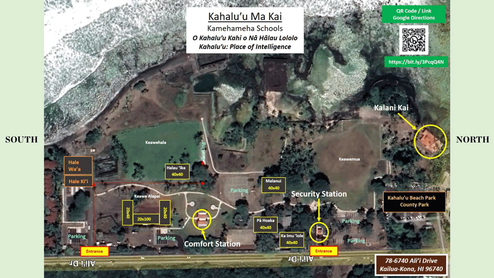 Map shows vendors, speakers, entertainment and food for the 25th anniversary Ka Lani Kauikeaouli Festival coming up May 9 at Kahaluʻu Ma Kai, a revered wahi pana and royal ceremonial compound, in Keauhou. Attendees are encouraged to bring lawn chairs, umbrellas (no staking) and refillable water bottles. Water refill stations will be available. (Courtesy Image: Ka Lani Kauikeaouli Festival web page at the Kamehameha Schools website)