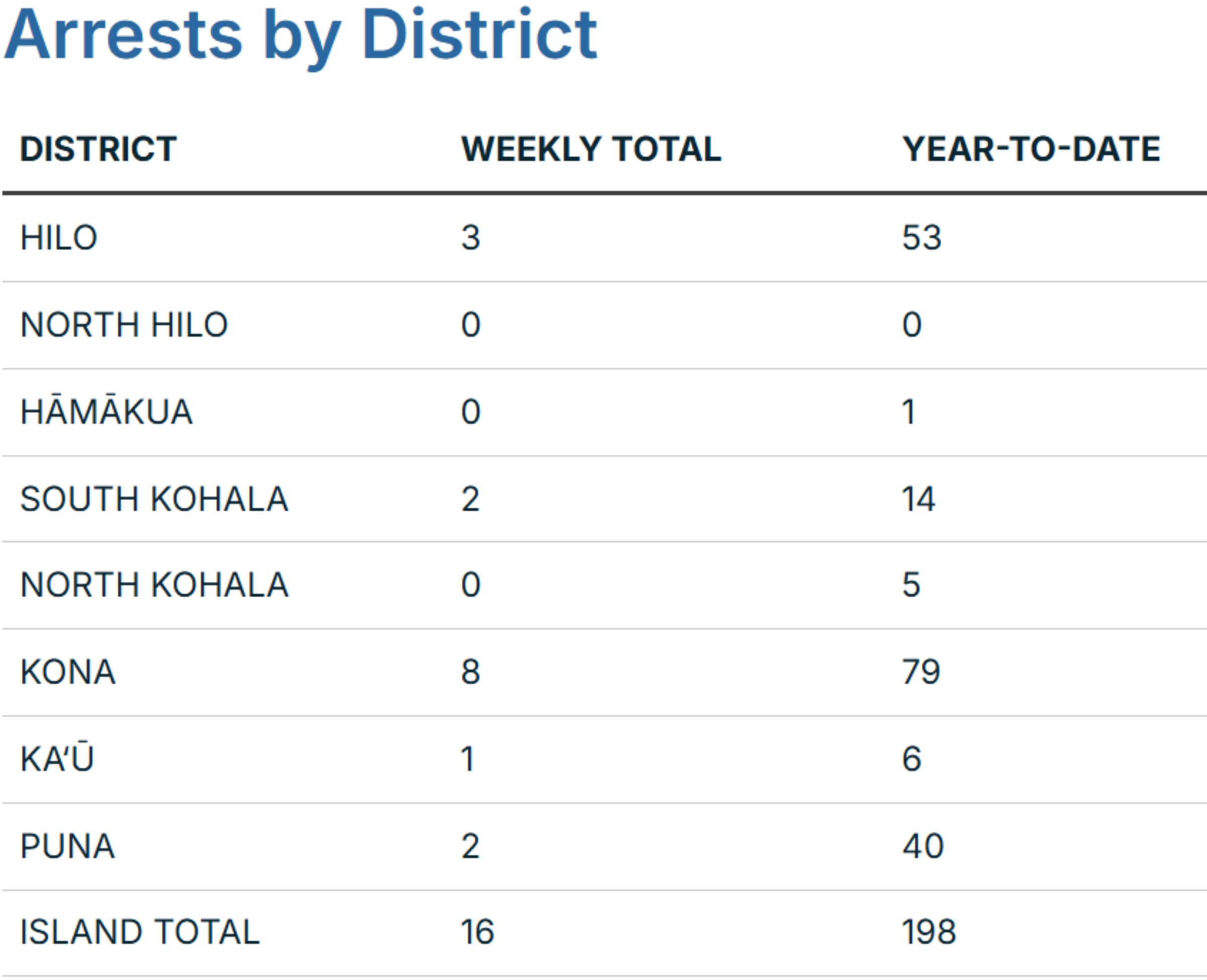 Kona claimed eight of those arrests, followed by Hilo with three and South Kohala and Puna each with two DUI arrests to round out the districts with the most arrests during the week.