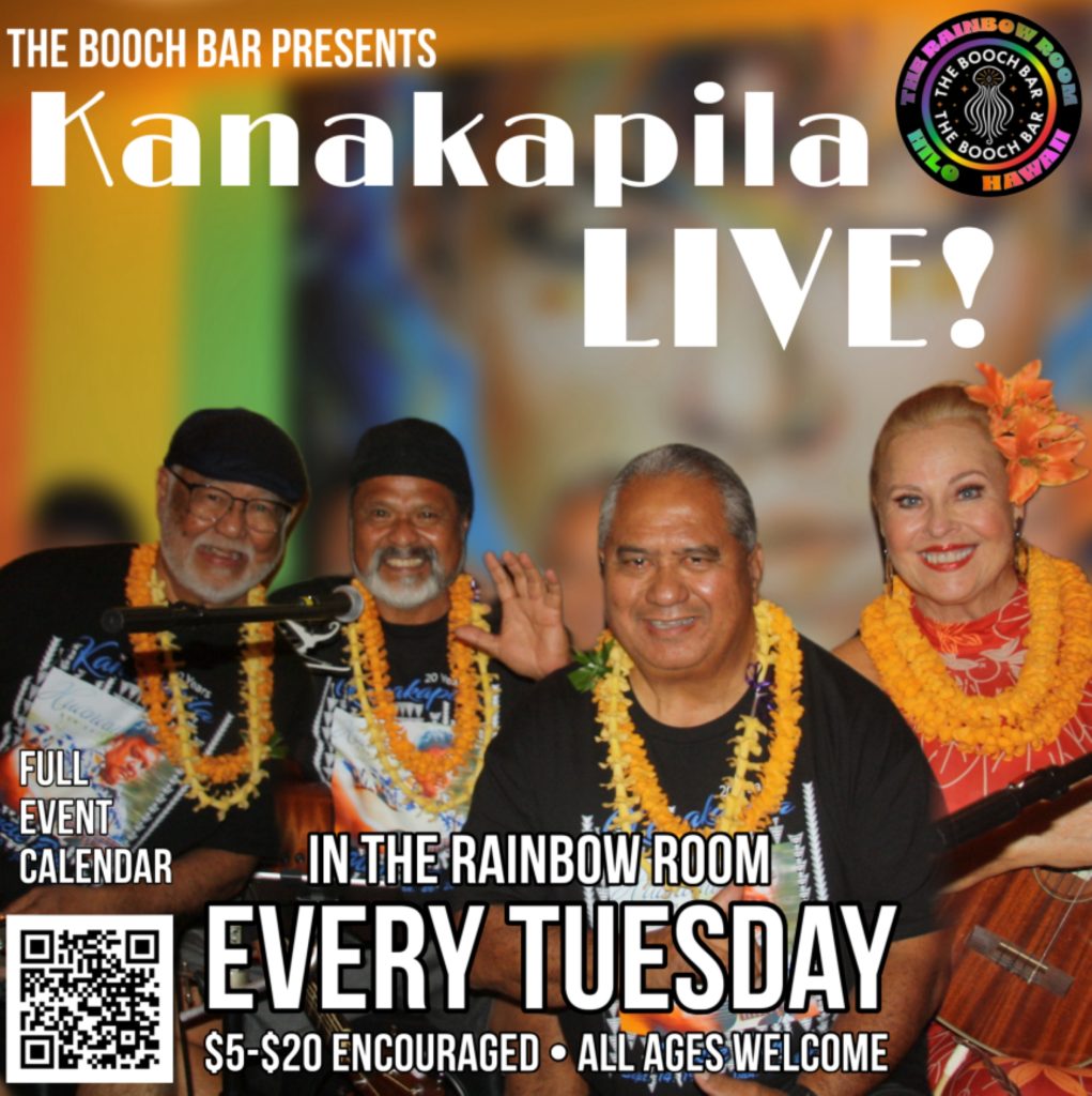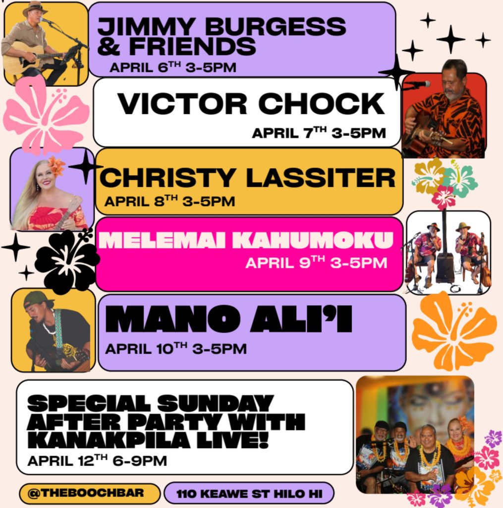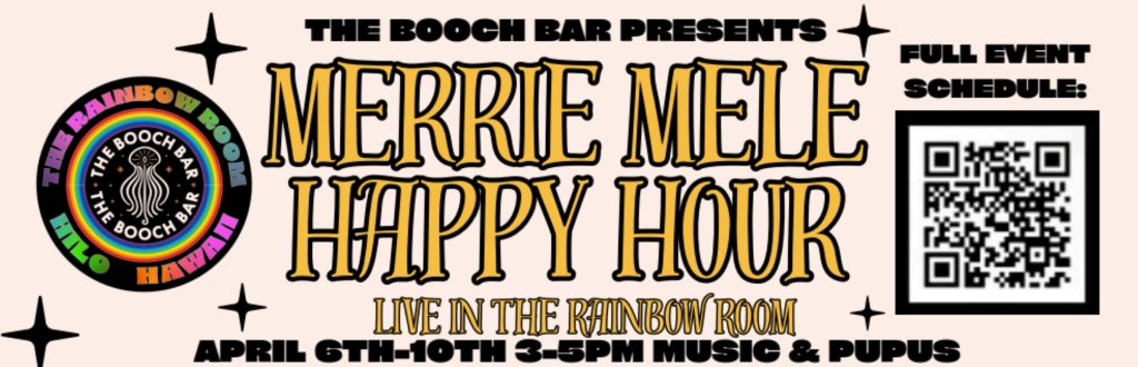 Don’t miss Merrie Mele Happy Hour live in The Rainbow Room at The Booch Bar in Hilo