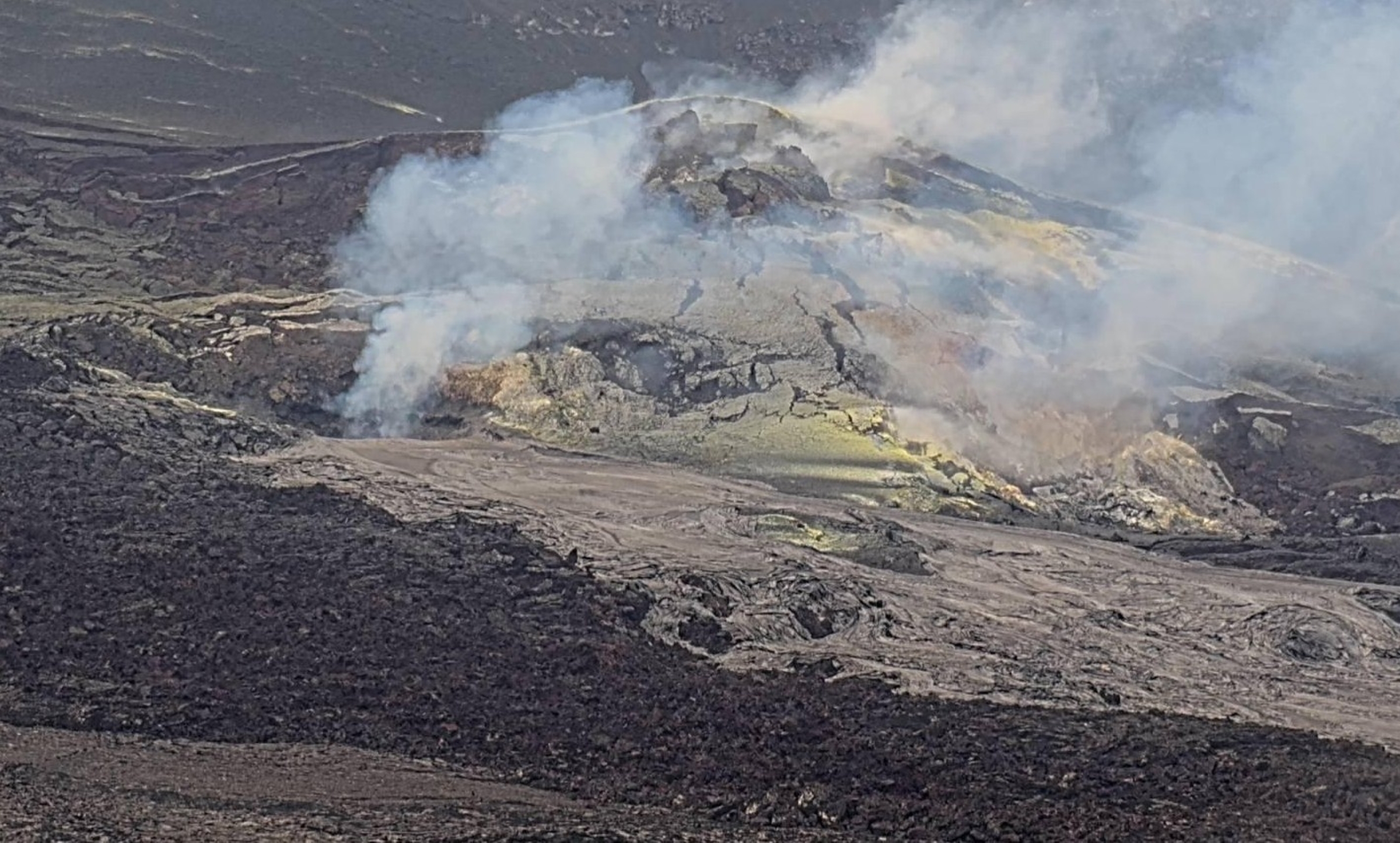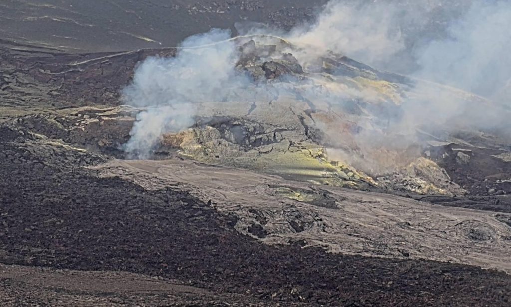 The south vent spattered and slowly oozed lava onto the floor of Halemaʻumaʻu Crater on April 3, marking the start of the precursory eruption activity.