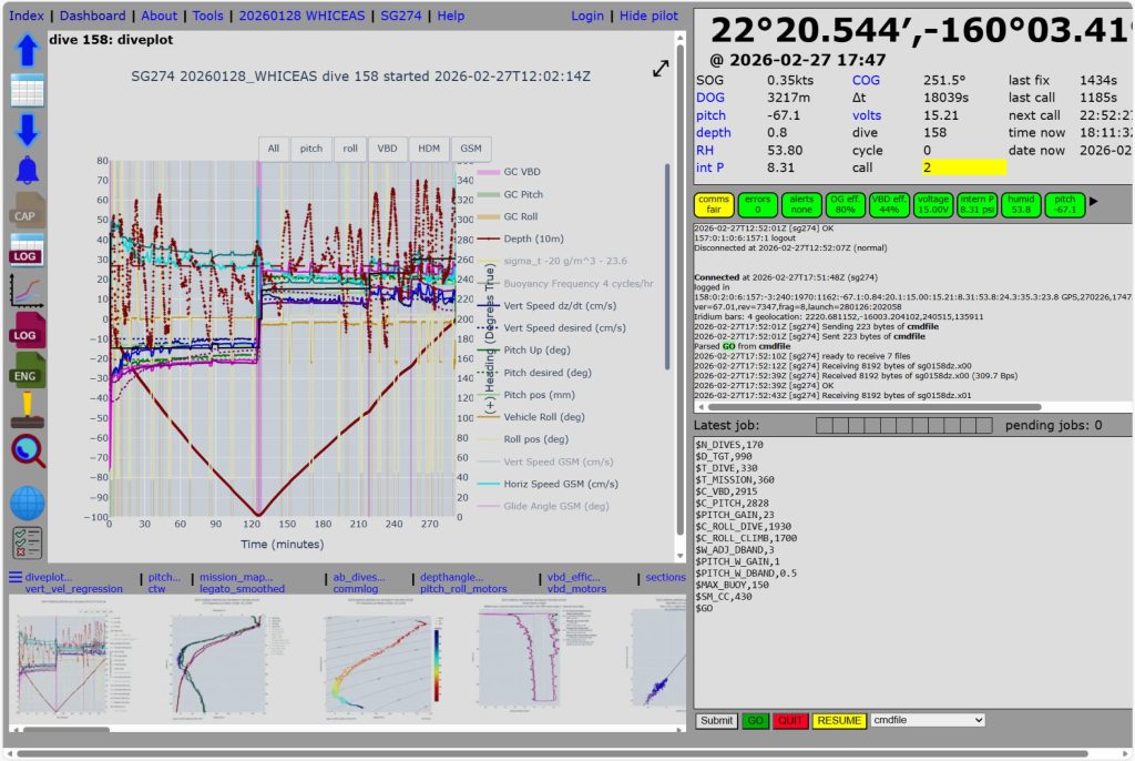 The information it sends back is processed into plots that I review on my computer, looking for patterns or warning signs. Each glider type has a slightly different base station and way to send and receive commands, but the theory is generally the same.