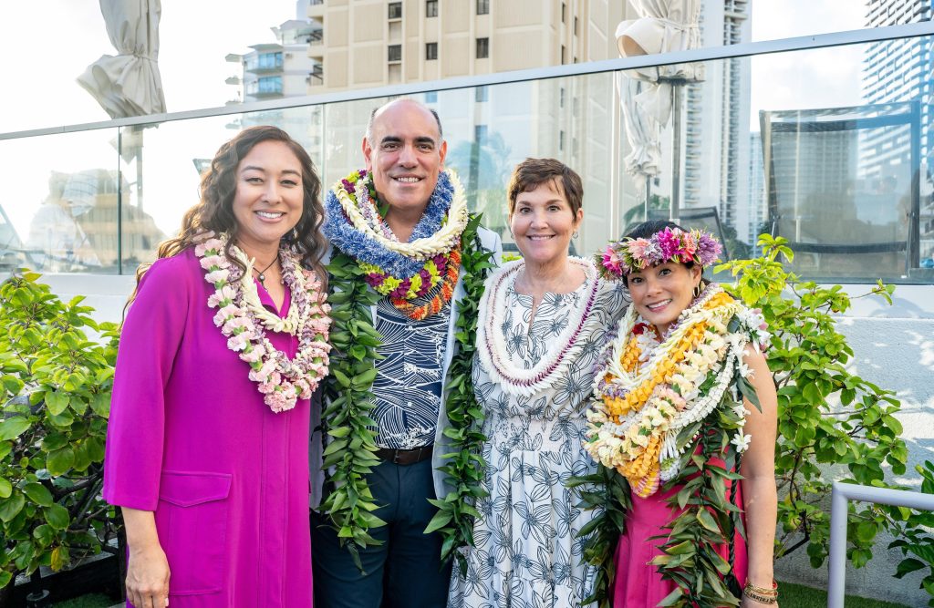 From left, Julie Morikawa, Elliot Mills, UH System President Wendy Hensel and Kylie Matsuda-Lum take a photo together during the Celebrate a Legacy in Tourism” gala on March 31. (Credit: Paula Ota)