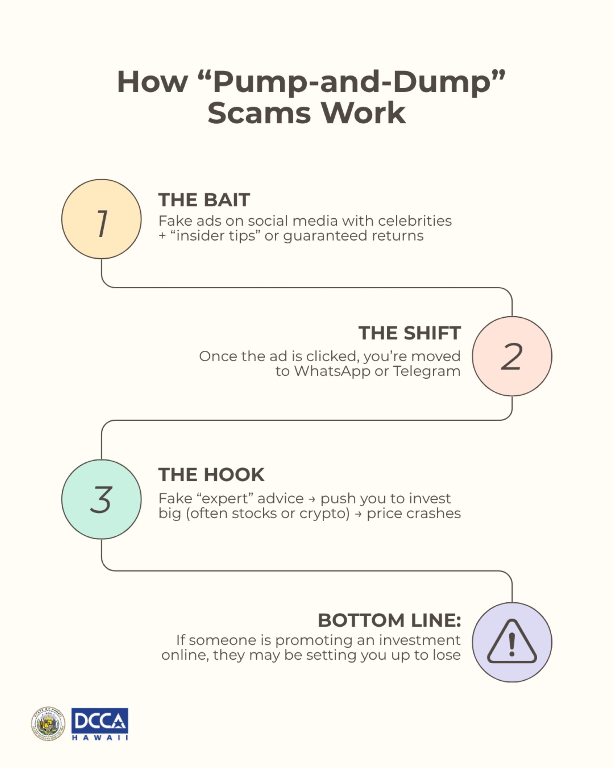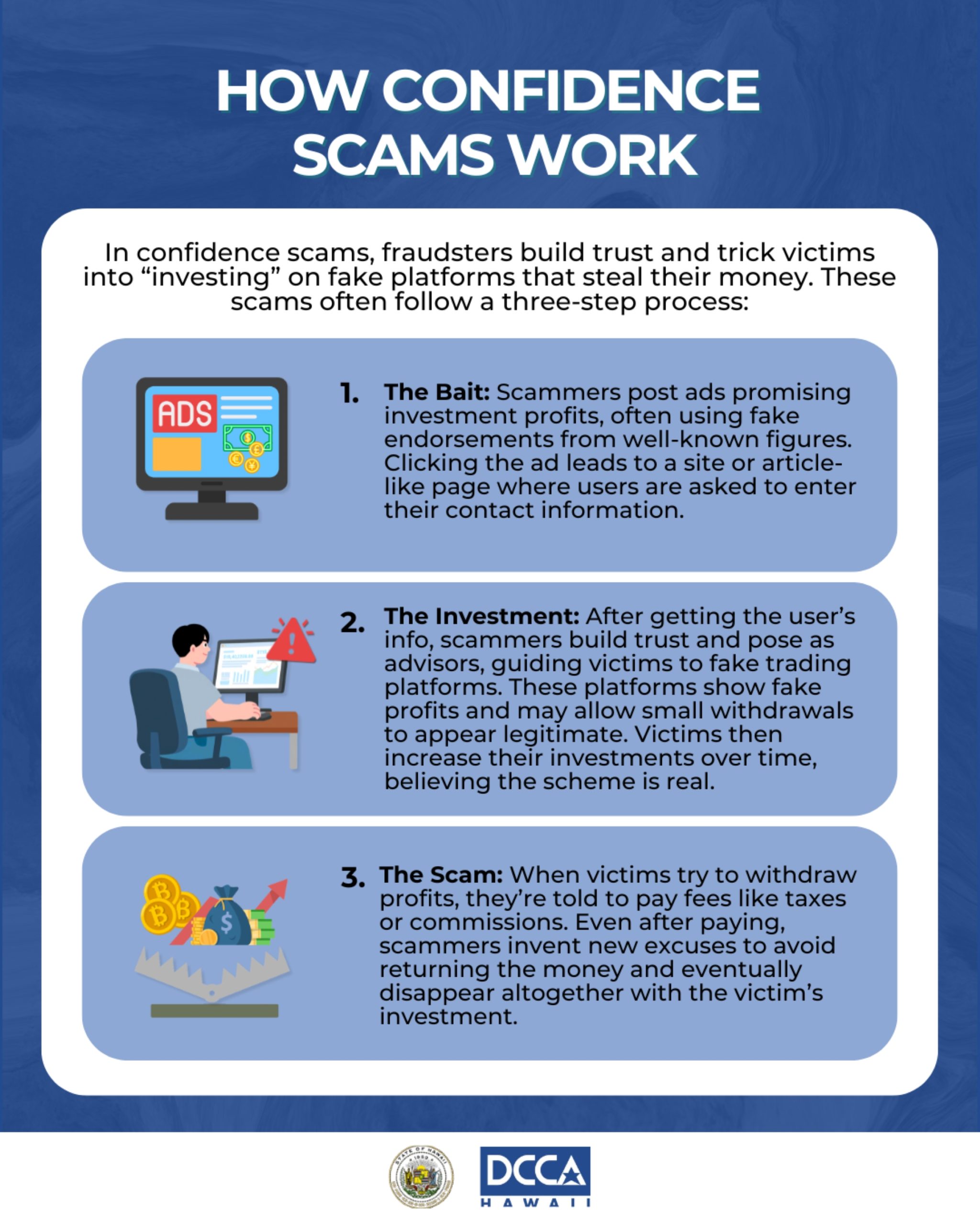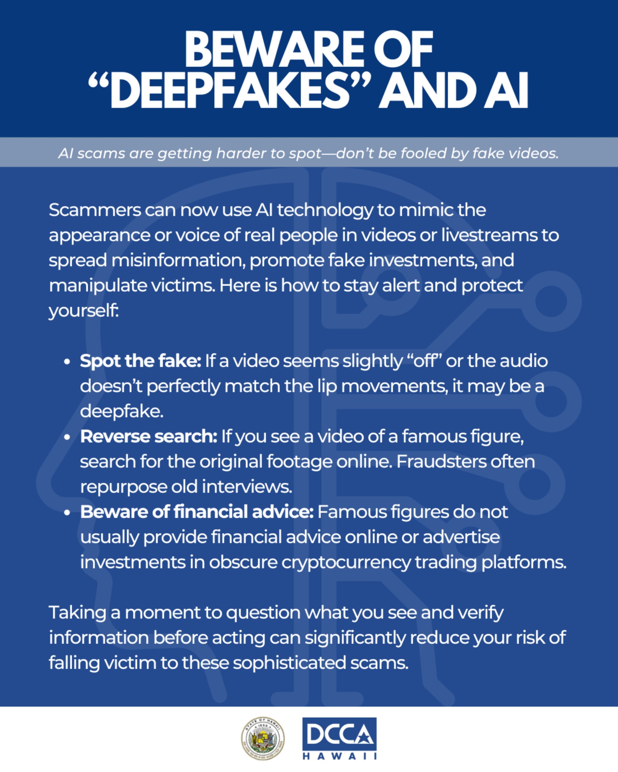 “Scammers are using social media and sophisticated tactics like deepfakes to lure Hawaiʻi residents into fraudulent investment schemes,” said Office of Consumer Protection Executive Director Mana Moriarty in a state release about the scams. “Consumers should be extremely cautious of any online investment opportunity — especially those promising guaranteed returns — and take time to verify before investing.”