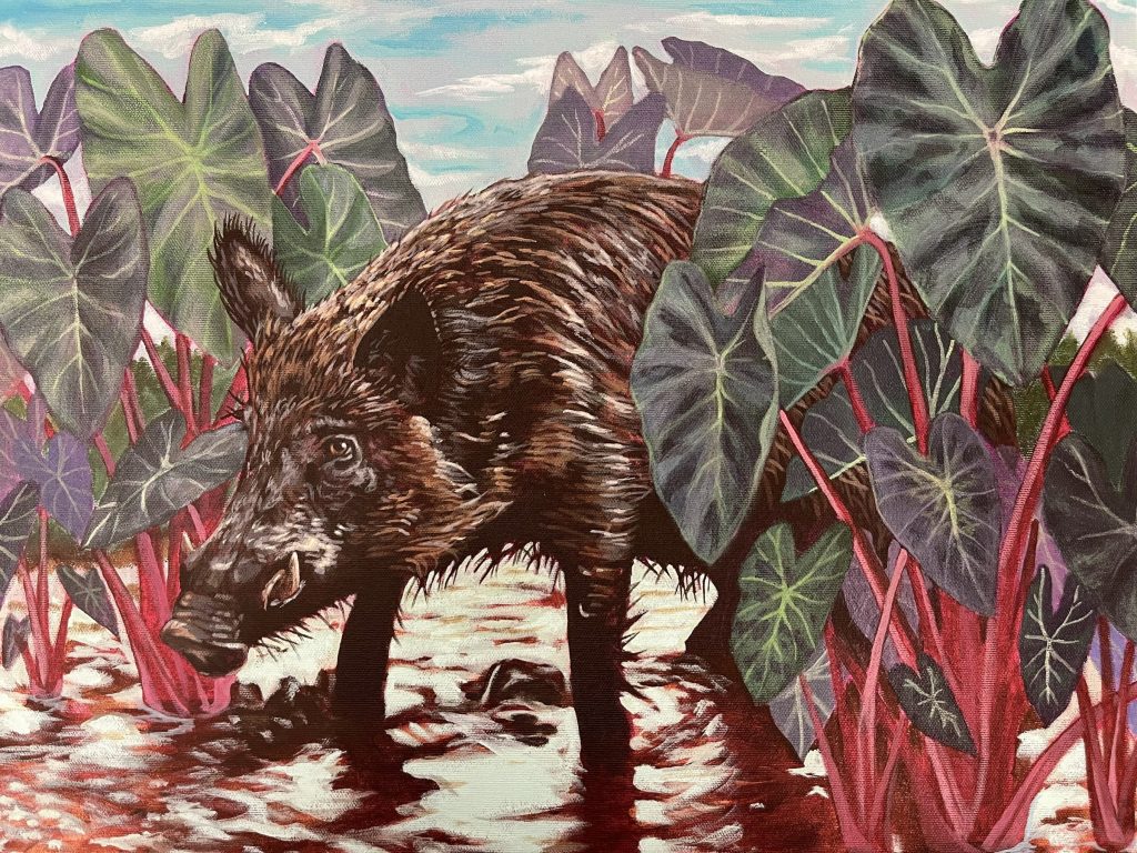 • Conservation stamp winner: Kūākea Yasak. Winning submission features a burly wild boar within a cultivated kalo, or tar0, patch.