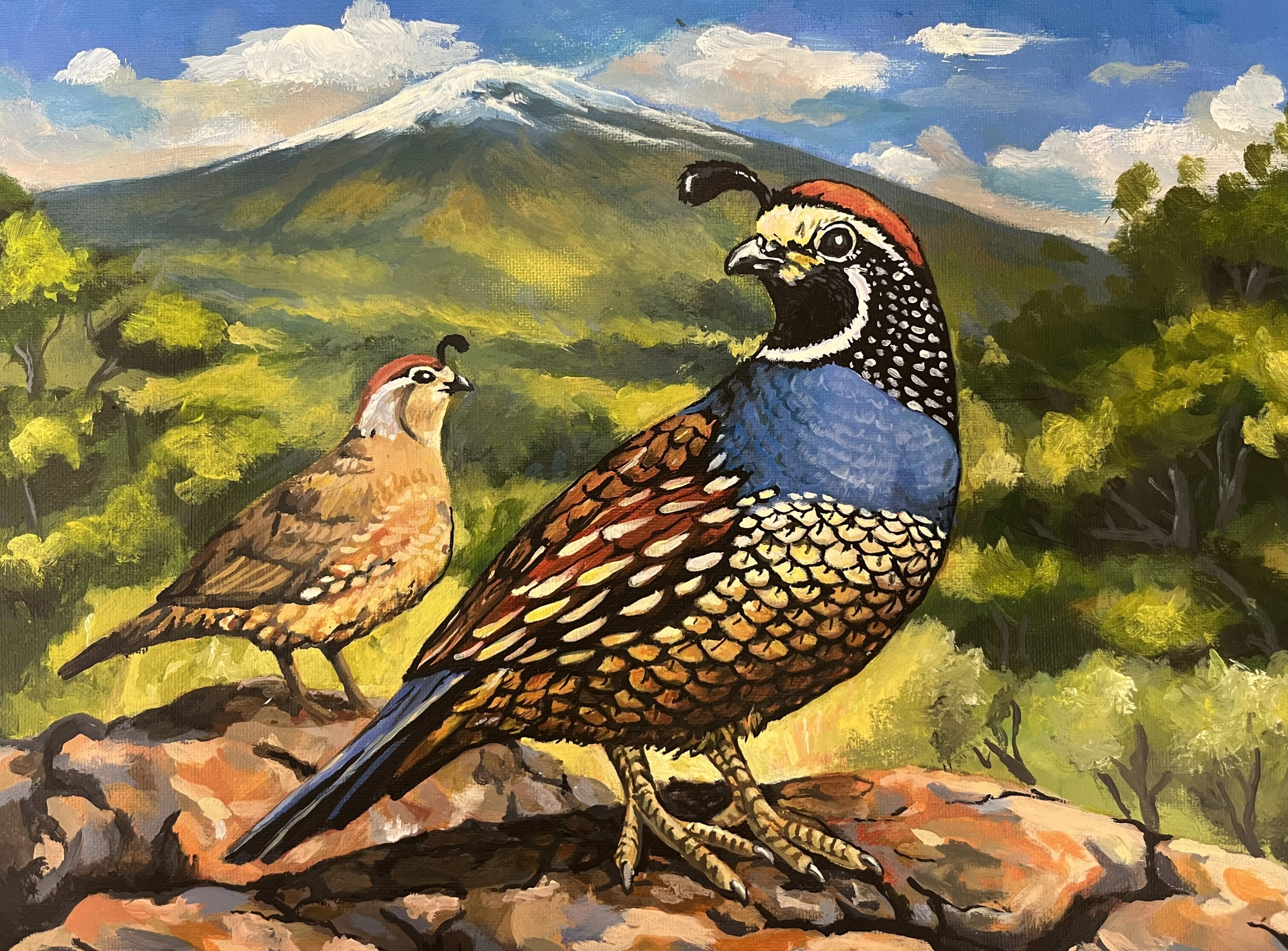 • Game bird stamp winner: Alvin Galvez. Winning submission depicts male and female California valley quails proudly perched on a rocky outcrop, set against a sweeping mountain backdrop.