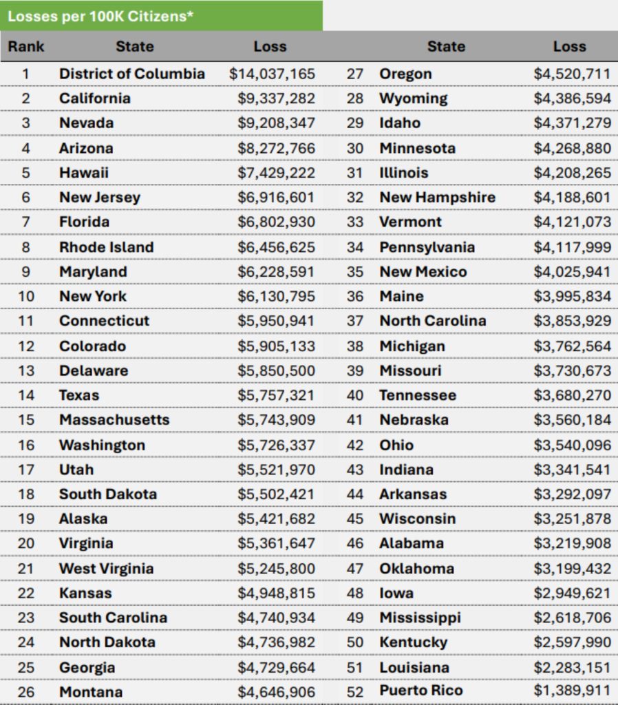 Hawai’i consumers reported losing more than $7.4 million per 100,000 residents, ranking Hawai’i behind only Arizona with $8.2 million, Nevada with $9.2 million, California with $9.3 million and District of Columbia with $14 million in losses as well as ahead of New Jersey with $6.9 million lost.