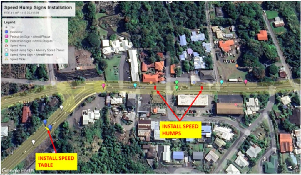 Big Island motorists are notified that two speed humps on Māmalahoa Highway and a speed table on Kuakini Highway will be installed later this week in Honalo.