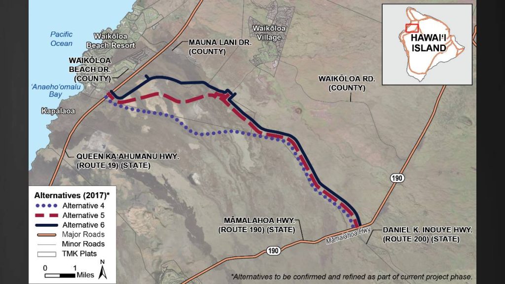 The Transportation Department described the proposed project as an “integral element of the road network for cross-island traffic,” connecting transportation users to Ellison Onizuka Kona International Airport and Hilo International Airport, state harbors (Kawaihae and Hilo), beaches and resorts in South Kohala and Kona, and population centers in Hilo, Waimea, Waikōloa Village and Kailua-Kona.