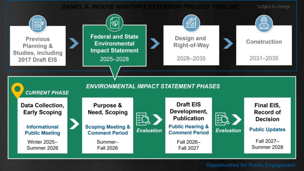 The state Department of Transportation, in conjunction with the Federal Highway Administration, will begin holding public meetings about the extension project, with the first informational open house scheduled for May 20, from 6 to 8 p.m. at Waikōloa Elementary and Middle School, located at 68-1730 Hoʻoko St. in Waikōloa.
